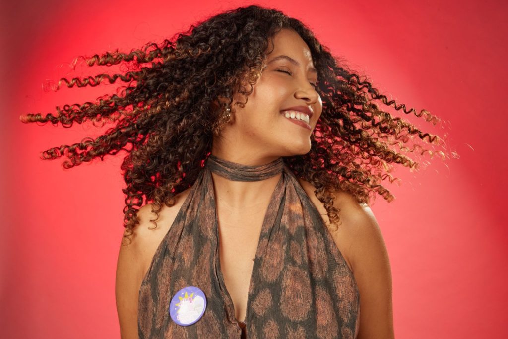 • Borrife nos fios: Com uma distância segura de cerca de vinte centímetros, borrife levemente sobre os cabelos secos ou úmidos. Isso garante que o cheiro acompanhe o movimento natural dos seus fios.